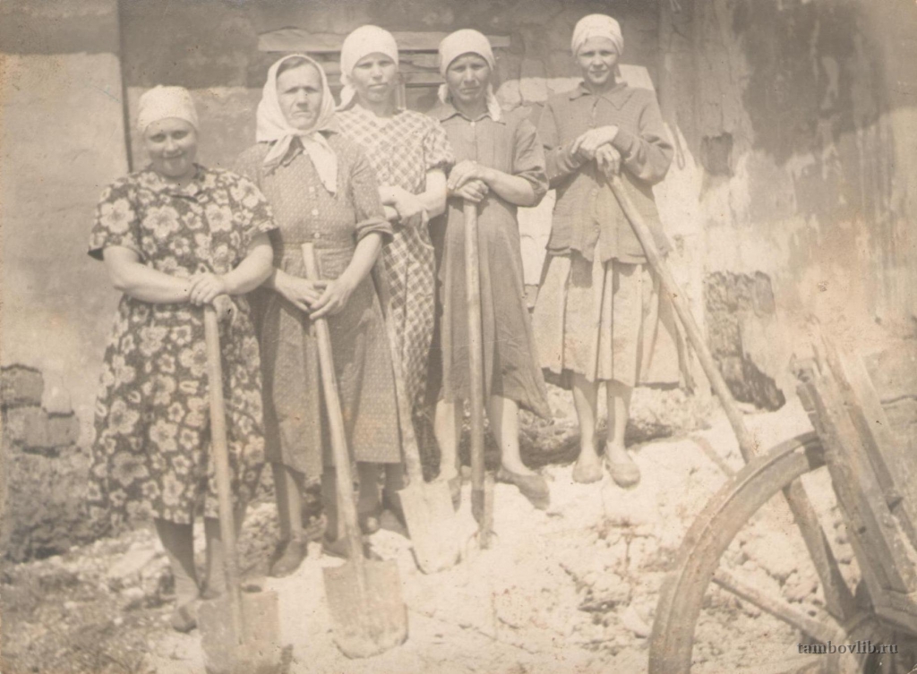 Среди работниц свиноводческой фермы Лебедева Анастасия Александровна (вторая слева). Фото предоставлено её дочерью - Мысиной Татьяной Петровной.1947 Межпоселенческая центральная библиотека Ржаксинского района Портрет Совхоз Ярославка, Тамбовская область, Россия, 393514