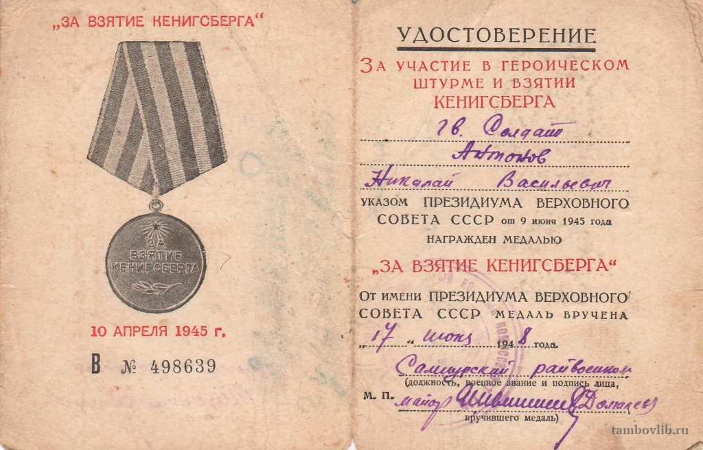 Удостоверение к медали "За взятие Кенигсберга"