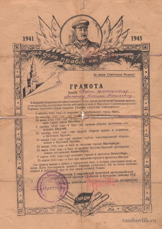 Антонов Николай Васильевич родился в 1914 году в с. Павловка Сампурского района Тамбовской области. Призван в армию в июне 1941 года. Воевал в составе 488 артиллерийского полка, 13 Гвардейской артиллерийской пушечной бригады, в должности тракториста. Рядовой. Награжден медалями "За отвагу", "За боевые заслуги", "За оборону Москвы", "За взятие Кенигсберга". Демобилизован 25 сентября 1945 года. Умер в 1986 году.04 августа 1945 Знаменская ЦБС Документ