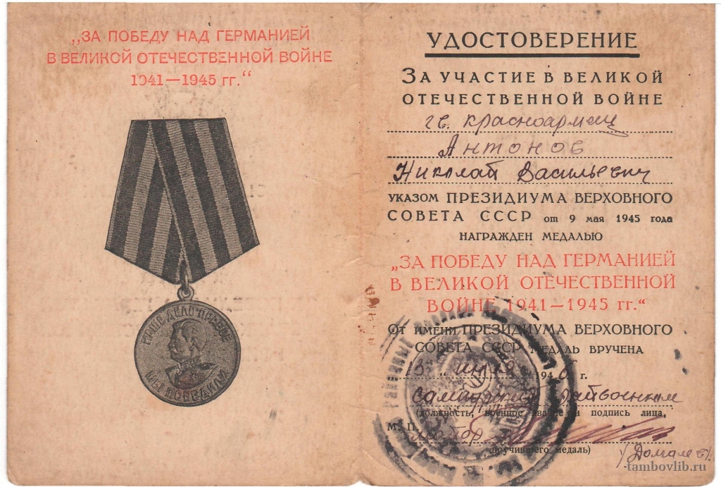 Антонов Николай Васильевич родился в 1914 году в с. Павловка Сампурского района Тамбовской области. Призван в армию в июне 1941 года. Воевал в составе 488 артиллерийского полка, 13 Гвардейской артиллерийской пушечной бригады, в должности тракториста. Рядовой. Награжден медалями "За отвагу", "За боевые заслуги", "За оборону Москвы", "За взятие Кенигсберга". Демобилизован 25 сентября 1945 года. Умер в 1986 году.13 июля 1946 Знаменская ЦБС Документ