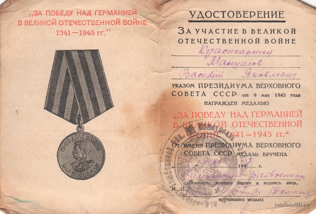 Мануйлов Василий Яковлевич родился в с. Павловка Сампурского района Тамбовской области в 1896 году. Призван в армию в 1942 году. Воевал под Сталинградом, на 3-м Украинском фронте. Демобилизован в 1945 году. Награжден медалями "За оборону Сталинграда", "За боевые заслуги", "За Победу над Германией в Великой Отечественной войне 1941-1945 гг."14 мая 1947 Знаменская ЦБС Документ