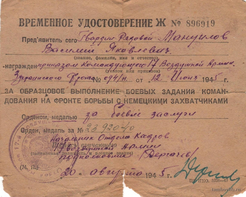 Мануйлов Василий Яковлевич родился в с. Павловка Сампурского района Тамбовской области в 1896 году. Призван в армию в 1942 году. Воевал под Сталинградом, на 3-м Украинском фронте. Демобилизован в 1945 году. Награжден медалями "За оборону Сталинграда", "За боевые заслуги", "За Победу над Германией в Великой Отечественной войне 1941-1945 гг."20 августа 1945 Знаменская ЦБС Документ