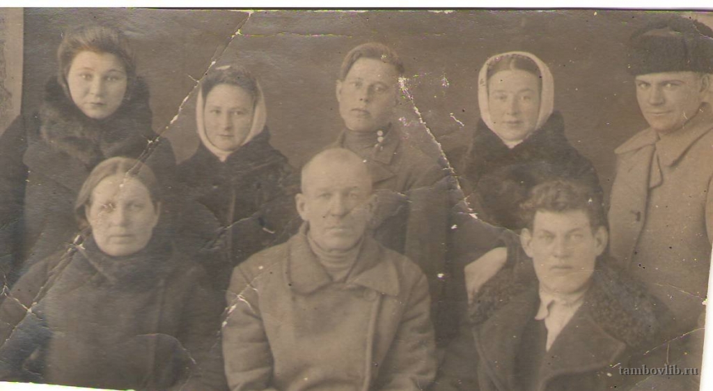 Нижний ряд справа Титаев Алексей Иванович-участник Великой Отечественной войны, Новгородов Федор Константинович -участник Великой Отечественной войны, Новгородова Аграфена Гавриловна - труженица тыла. Стоят справа Мишин Иван Петрович, Мишина Мария Федоровна - труженица тыла, Новгородов Семен Федорович- труженик тыла, Алехина Антонина Ивановна, Тоцкая Антонина Петровна.Центральная библиотека Мучкапского района Семейное Мучкапский, Тамбовская область, Россия