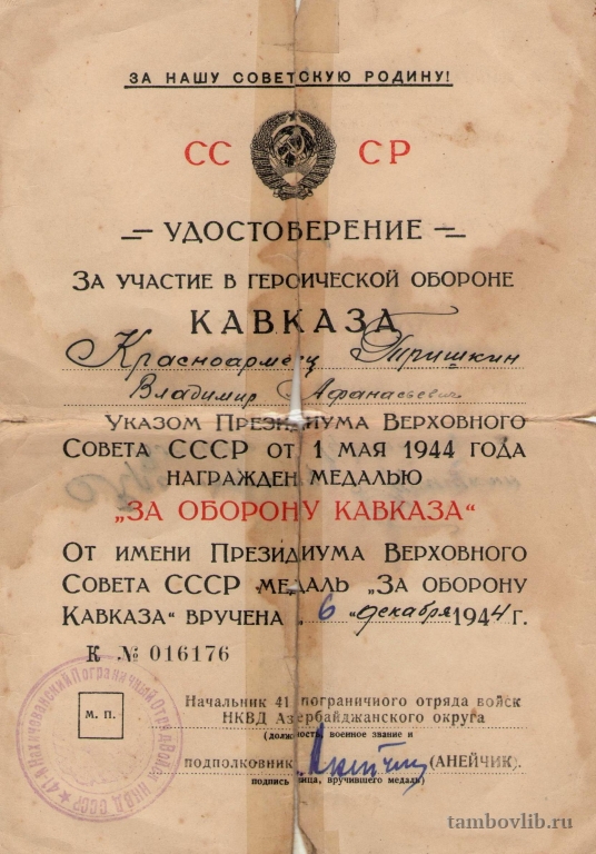 Удостоверение к медали "За оборону Кавказа" Тришкина Владимира Афанасьевича