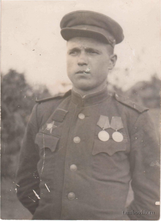 Родился в с. Глебовка Сараевского района Рязанской области 13 июня 1924 года. На фронт был призван в августе 1942 года. Был стрелком, помощником командира взвода, командиром взвода. Дошел до Германии. Был трижды ранен. Имеет награды: Орден Красной Звезды, 2 медали "За отвагу", медаль "За взятие Кёнигсберга", "За победу над Германией в Великой Отечественной войне в 1941-1945 гг." После Победы приехал в р.п.Знаменку Тамбовской области, работал в "Сельхозтехнике" водителем. Скончался 17 марта 1982 года. Фото из семейного архива Кулешова Александра Петровича.02 июля 1945 Знаменская ЦБС Портрет Германия