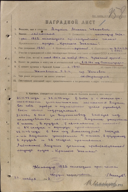 Наградной лист Якунина Михаила Ивановича