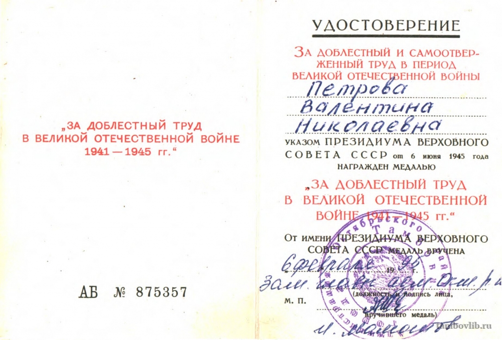 Удостоверение к медали "За доблестный и самоотверженный труд во время Великой Отечественной войны 1941-1945 гг." Валентины Николаевны Чиж (Петровой), педагога Тамбова.