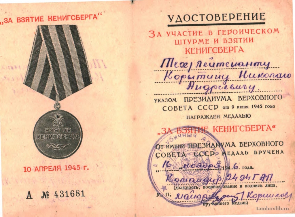 Удостоверение к медали "За взятие Кенигсберга" Корытина Николая Андреевича