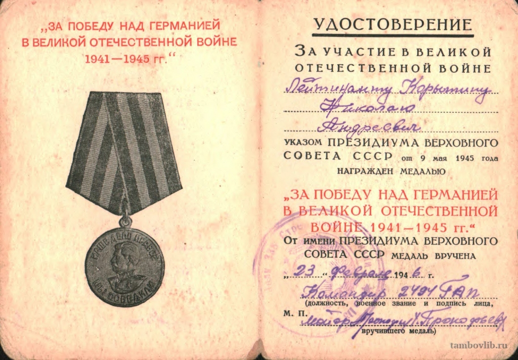 Удостоверение к медали "За победу над Германией в Великой Отечественной войне 1941-1945 гг." Корытина Николая Андреевича