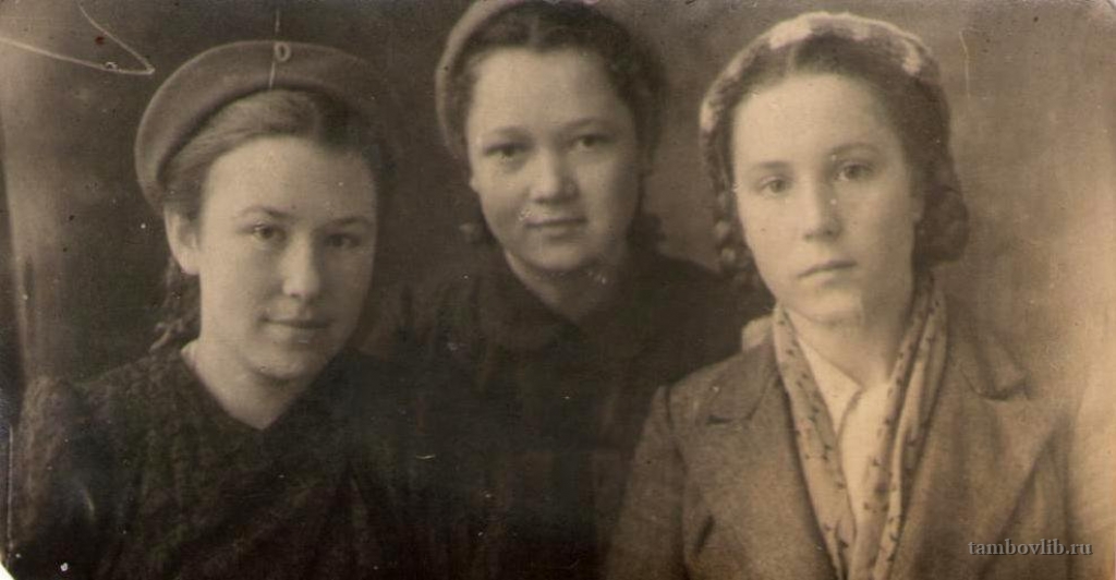 Школьные подруги: слева - Анна Климонова (Перепелкина), в центре - Ольга Зверева (Перепелкина). Фотография предоставлена дочерью А. Перепелкиной, жительницей р. п. Инжавино Козиной Ириной Николаевной.1944 Межпоселенческая центральная библиотека Инжавинского района Портрет с. Инжавино