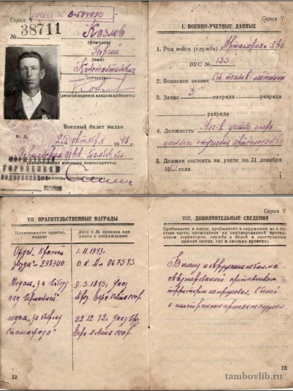 Георгий Константинович призван в армию в 1942 году. Демобилизован в 1945 году. Награжден Орденом Красной Звезды, медалью "За победу над Германией", медалью "За оборону Сталинграда".Добавлена 21 Апреля 2015