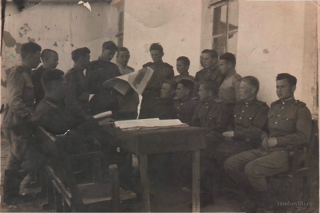 На фото: Старшина Талызин Василий Сергеевич (с газетой) проводит политинформацию с летно-техническим составом. Фото из семейного альбома его дочери Минаевой Татьяны Васильевны.1945 Знаменская ЦБС В тылу Ашхабад, Туркменистан