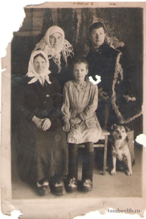 Семья Поповых - сидит Марфа Васильевна, дочь Анна, стоят сноха Евдокия и сын Александр. Фотография из семейного архива внучки, жительницы с. Староюрьева Сухаревой Зои Васильевны.1952 Межпоселенческая библиотека Староюрьевского района Семейное