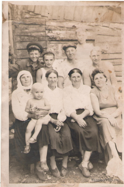 Сидят слева на право Варвара, девочка Лиля, Марфа Васильевна, Евдокия и Вера. Стоят справа налево Александр и родственники. Фото предоставлено из семейного архива библиотекарем Девицкой Мариной Валерьевной.1953 Межпоселенческая библиотека Староюрьевского района Семейное село Подгорное