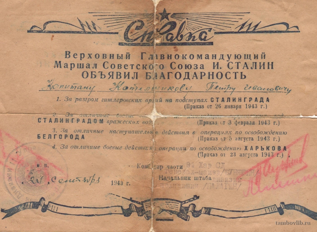 Благодарность 1943 года капитану Котельникову Петру Ивановичу, уроженцу поселка Куракино, Ольшанского сельского совета Уваровского района Тамбовской области за разгром гитлеровских армий на подступах Сталинграда,отличные наступательные и боевые действия в операциях по освобождению Белгорода и Харькова. Благодарность объявлена Верховным Главнокомандующим Маршалом Советского Союза И.Сталиным 21 сентября 1943 года