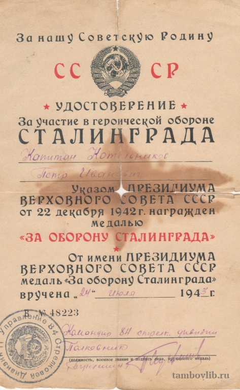 Удостоверение За участие в героической обороне Сталинграда капитана Котельникова Петра Ивановича, уроженца поселка Куракино, Ольшанского сельского совета Уваровского района Тамбовской области.