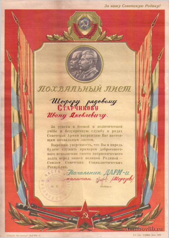 Старчиков Иван Яковлевич, солдат Советской Армии, 1950-1953, г. Батайск.1952 Межпоселенческая центральная библиотека Пичаевского района Документ