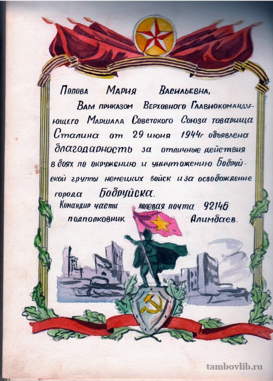 Благодарным письмом за отличные действия в боях под Бобруйском награждена Попова Мария Васильевна