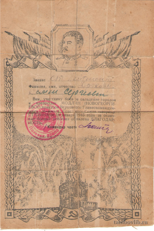 Дрокову Семену Сергеевичу старшему лейтенанту, участнику боев за овладение городом и крепостью МОДЛИН (НОВОГЕОРГИЕВСК) приказом Верховного Главнокомандующего Маршала Советского Союза товарища СТАЛИНА от 18 января 1945 года за отличные боевые действия объявлена БЛАГОДАРНОСТЬ. Фотография документа предоставлена Дроковой Наталией Ивановной18 января 1945 Межпоселенческая библиотека Староюрьевского района Документ