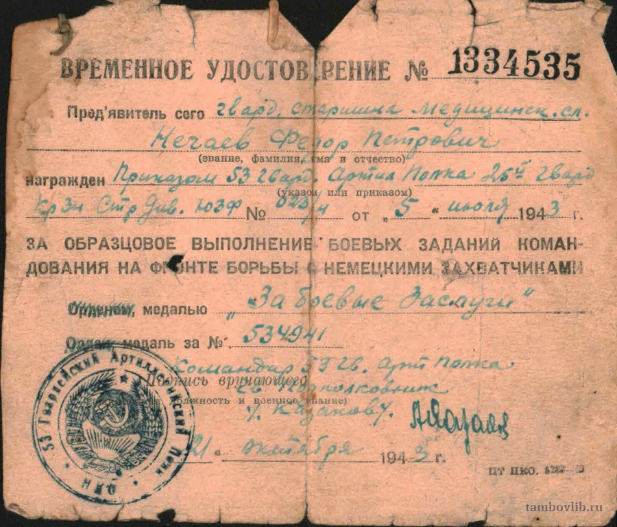 Временное удостоверение Нечаева Федора Петровича, гвардии старшина медицинской службы