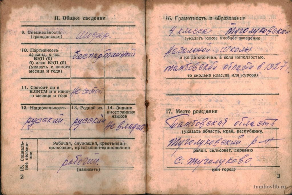 Родился в 1911 г. в с. Туголуково Жердевского района Тамбовской области. Был призван в армию Мордовским РВК Тамбовской области в 1933 г. в переменный состав. С июля 1941 по август 1946 г. проходил службу шофером при 2042 складе ВМС. Демобилизован 23 декабря 1947 г. Награждён медалью «За победу над Германией в Великой Отечественной войне 1941-1945 гг.». На фото военный билет.