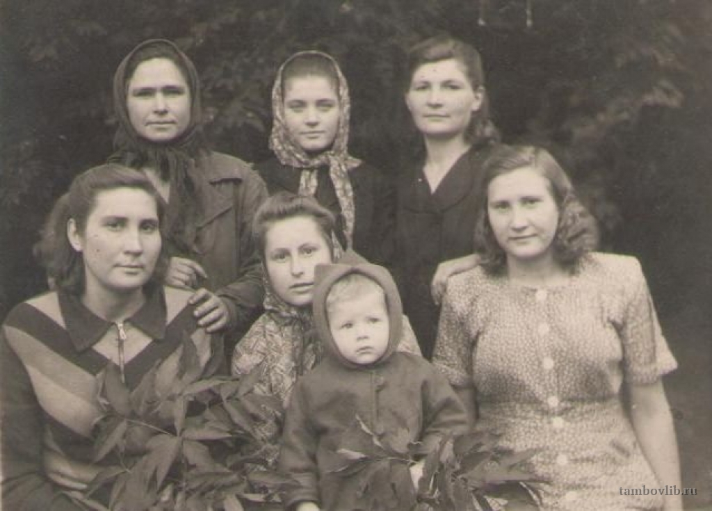 Работники Кирсановского элеватора: Алаторцева Мария, Алаторцева Анна, Алаторцева Валентина, Саблина Зоя, Осипова Татьяна, Яковлева Валентина, Полякова Маргарита (маленькая девочка)
