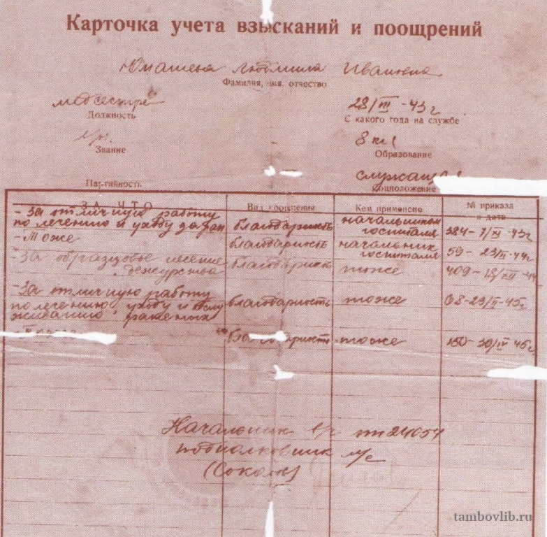Карточка учета взысканий и поощрений медсестры эвакогоспиталя Л. И. Юмашевой. 1943-1945 гг.