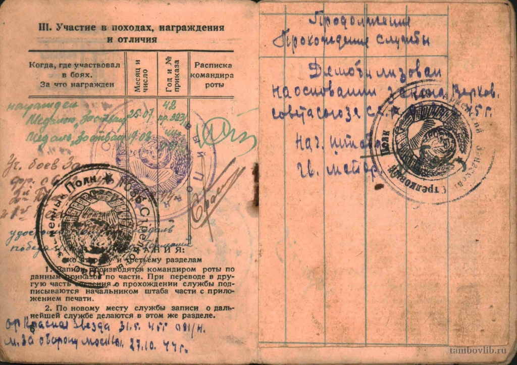 Родился в 1901 г. в с. Троицкая Дубрава Лысогорского района Тамбовской области. Образование 3 класса. Работал до войны плотником в колхозе. С 1920-1924 гг. участник Гражданской войны в Туркестане, 6 отдельная Алтайская кавалерийская бригада РККА. На фронт был призван Лысогорским РВК в августе 1941 г. Служил в 323 стрелковой дивизии под командованием подполковника И. А. Гарцева. Первое боевое крещение принял под Москвой 6 декабря 1941 г. в ходе Тульской наступательной операции Московской битвы в качестве разведчика конного взвода. Участвовал в обороне Москвы, взятии городов Епифань, Сухиничи, Брянск, форсировании р. Друть, взятии городов Бобруйск, Белосток, прорыве на р. Висла, вступлении в Брандербургскую провинцию и наступлении на Берлин. Награждён орденом «Красной звезды», двумя медалями «За отвагу», медалями «За оборону Москвы», «За освобождение Варшавы», «За взятие Берлина», «За победу над Германией в ВОВ 1941-1945 гг.». Мобилизован в августе 1945 г. старшим сержантом, командиром отделения конников роты автоматчиков 1086 стрелкового Краснознаменного полка 323 стрелковой Брянской Краснознамённой ордена Суворова II степени дивизии. Умер 28.07.1956 г. На фото Красноармейская книжка.