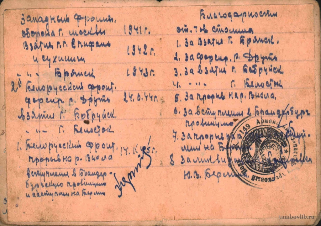 Родился в 1901 г. в с. Троицкая Дубрава Лысогорского района Тамбовской области. Образование 3 класса. Работал до войны плотником в колхозе. С 1920-1924 гг. участник Гражданской войны в Туркестане, 6 отдельная Алтайская кавалерийская бригада РККА. На фронт был призван Лысогорским РВК в августе 1941 г. Служил в 323 стрелковой дивизии под командованием подполковника И. А. Гарцева. Первое боевое крещение принял под Москвой 6 декабря 1941 г. в ходе Тульской наступательной операции Московской битвы в качестве разведчика конного взвода. Участвовал в обороне Москвы, взятии городов Епифань, Сухиничи, Брянск, форсировании р. Друть, взятии городов Бобруйск, Белосток, прорыве на р. Висла, вступлении в Брандербургскую провинцию и наступлении на Берлин. Награждён орденом «Красной звезды», двумя медалями «За отвагу», медалями «За оборону Москвы», «За освобождение Варшавы», «За взятие Берлина», «За победу над Германией в ВОВ 1941-1945 гг.». Мобилизован в августе 1945 г. старшим сержантом, командиром отделения конников роты автоматчиков 1086 стрелкового Краснознаменного полка 323 стрелковой Брянской Краснознамённой ордена Суворова II степени дивизии. Умер 28.07.1956 г. На фото Красноармейская книжка.Добавлена 29 Апреля 2015