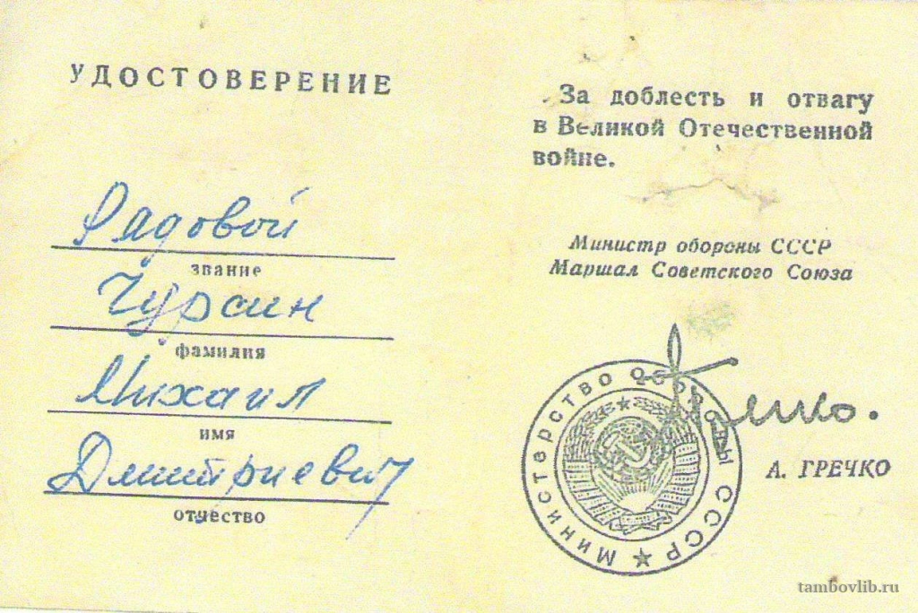 Удостоверение Чурсина Михаила Дмитриевича "За доблесть и отвагу в Великой Отечественной войне"