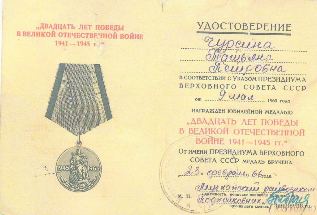 Удостоверение к юбилейной медали "20 лет Победы в Великой Отечественной войне 1941-1945 г.г." Чурсиной Татьяны Петровны.
