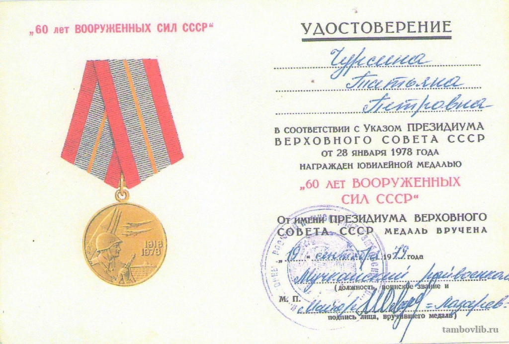 Родилась 23 декабря 1922 года с. Мучкап Тамбовской области. Призвана в армию 05.06. 1942 г., демобилизована в 1945 году, старший сержант. Служила в годы войны в 40 отдельной роте связи телеграфисткой. Награждена: орденом Отечественной войны II степени,медалью "За победу над Германией", юбилейными медалями. Ветеран труда. Умерла 22 января 1988 года. Фото предоставила Чурсина Наталья Алексеевна.Центральная библиотека Мучкапского района Документ