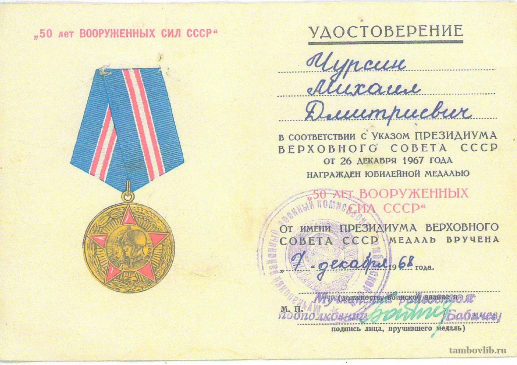 Удостоверение к медали Чурсина Михаила Дмитриевича