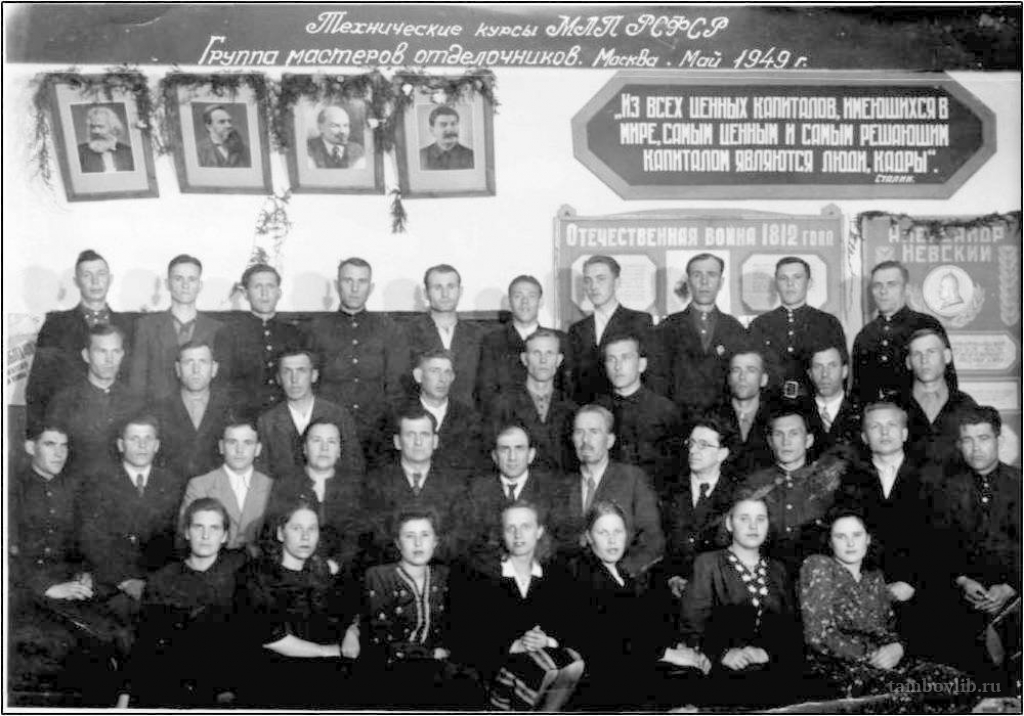 В третьем ряду второй слева - Бочаров Николай Васильевич.Николай Васильевич проходил службу на Военно-Грузинской дороге, где и застал начало Великой Отечественной войны. На Харьково-Борвинском направлении при вывозе документов части попал в плен. После войны с 1948 года работал на суконной фабрике г. Моршанска, был талантливым рационализатором, победителем соцсоревнований.1949 ЦБС города Моршанска В тылу