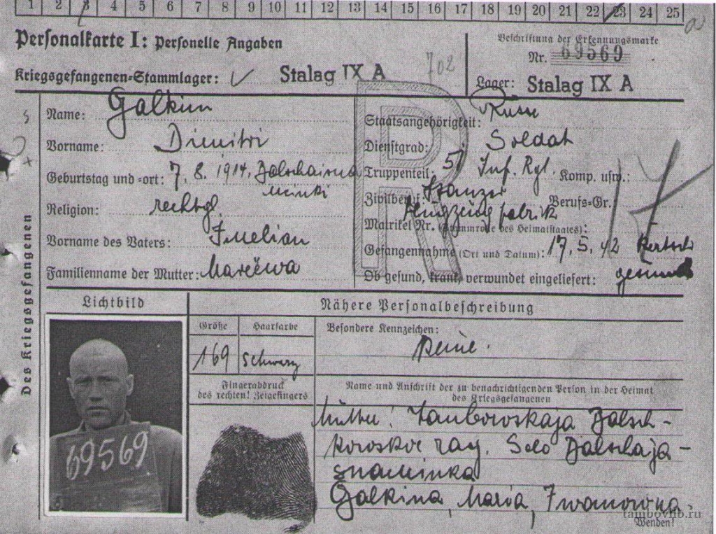 Карточка военнопленного на имя Галкина Дмитрия Емельяновича, уроженца села Большая Знаменка Петровского района 1914 года рождения.1942 Межпоселенческая централизованная библиотека Петровского района Документ