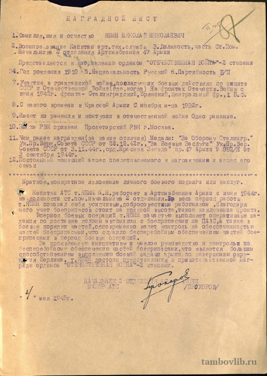 Родился 18 декабря 1910 г. в деревне Бородино Владимирской губернии. Кадровый офицер, в Красной Армии с 1932 г. Закончил Тамбовское артиллерийское училище. С 1942 г. на Сталинградском, Брянском, Центральном и 1 Белорусском фронтах. Капитан арт. тех. службы. Войну закончил в Берлине. Награжден медалью "За оборону Сталинграда", "За Боевые заслуги", "За освобождение Варшавы", "За взятие Берлина", орденом Красной Звезды и орденом Отечественной войны II степени.Добавлена 29 Апреля 2015