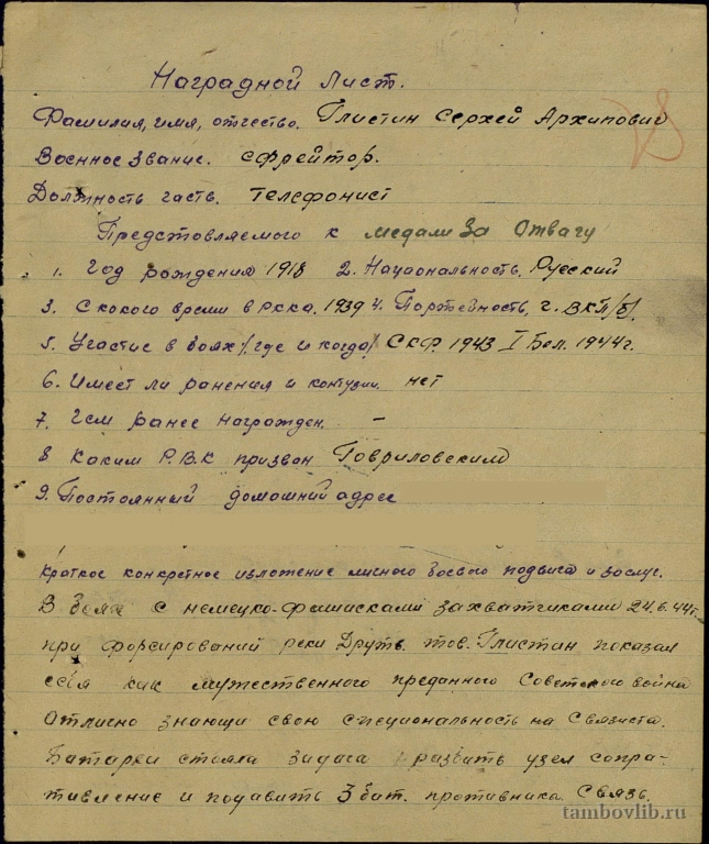 Родился в 1918 г. в с. Пересыпкино Кирсановского уезда. В Красной Армии с 1939 г. С 1943 г. на Северо-кавказском, с 1944 год. на 1 Белорусском фронтах. Старший телефонист арт. батальона. Войну закончил в Берлине. Награжден медалью "За Отвагу", орденом Красной Звезды. Умер в 1971 году.Добавлена 29 Апреля 2015