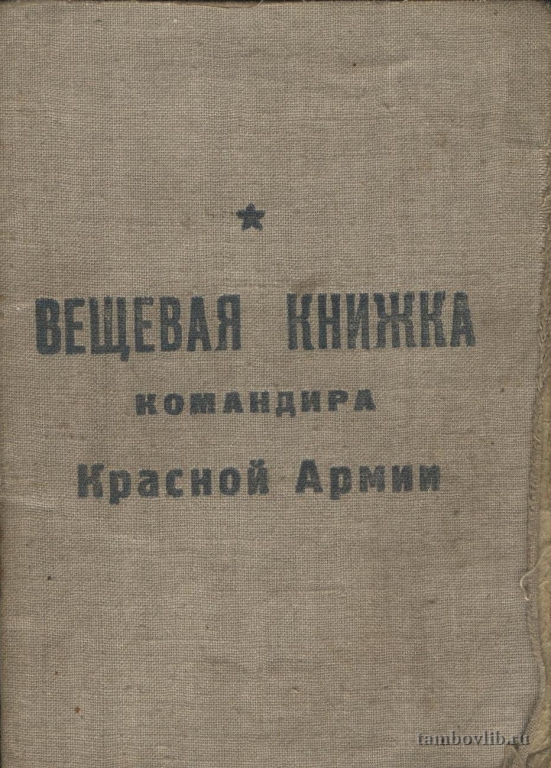 Вещевая книжка участника Великой Отечественной войны, командира пулеметного взвода 382 гвардейского стрелкового полка, младшего лейтенанта Козина Анатолия Тимофеевича. Козин А. Т. родился в с. Сергиевка Инжавинского района. Призван в армию в 1941, демобилизован в 1945 году. Награжден орденом Красной Звезды, орденом Отечественной войны II степени. После войны жил и работал в р. п. Инжавино. Документ из семейного архива внучки Межеделовой Елены Юрьевны.17 октября 1943 Межпоселенческая центральная библиотека Инжавинского района Документ