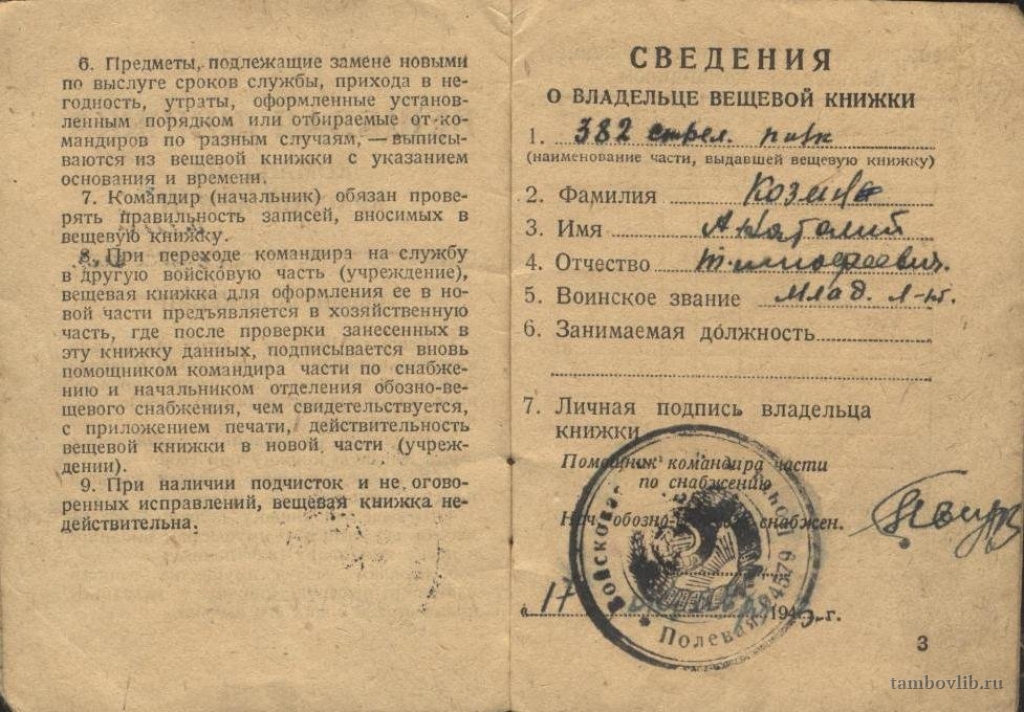 Вещевая книжка участника Великой Отечественной войны, командира пулеметного взвода 382 гвардейского стрелкового полка младшего лейтенанта Козина Анатолия Тимофеевича. Козин А. Т. родился в с. Сергиевка Инжавинского района. Призван в армию в 1941, демобилизован в 1945 году. Награжден орденом Красной Звезды, орденом Отечественной войны II степени. После войны жил и работал в р. п. Инжавино. Документ из семейного архива внучки Межеделовой Елены Юрьевны.17 октября 1943 Межпоселенческая центральная библиотека Инжавинского района Документ