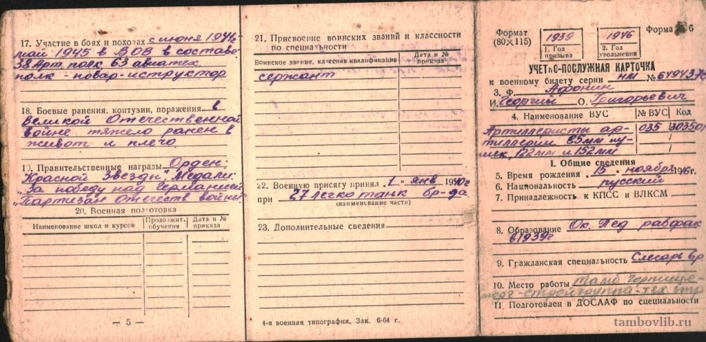 Родился 15 ноября 1916 г. в с. Куравщино Бондарского района Тамбовской области. Окончил Тамбовский педагогический рабфак. До войны работал слесарем. С ноября 1939 г. и по июль 1940 г. служил в 27 лёгкой танковой бригаде мастером. С июля по декабрь 1940 г. служил в 6 танковой бригаде командиром танка. С июня 1941 г. по май 1945 г. служил в составе 38 Артиллерийского полка командиром орудия 76 мм, 63 авиатехническом полку - поваром-инструктором. Звание – сержант. Демобилизован 20 марта 1946 г. Награждён орденом «Красной Звезды», медалями «За Победу над Германией», «Партизан Отечественной войны». Умер 20 марта 1979 г. На фото Учётно-послужная карточка.