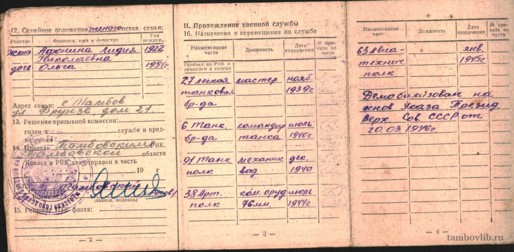 Родился 15 ноября 1916 г. в с. Куравщино Бондарского района Тамбовской области. Окончил Тамбовский педагогический рабфак. До войны работал слесарем. С ноября 1939 г. и по июль 1940 г. служил в 27 лёгкой танковой бригаде мастером. С июля по декабрь 1940 г. служил в 6 танковой бригаде командиром танка. С июня 1941 г. по май 1945 г. служил в составе 38 Артиллерийского полка командиром орудия 76 мм, 63 авиатехническом полку - поваром-инструктором. Звание – сержант. Демобилизован 20 марта 1946 г. Награждён орденом «Красной Звезды», медалями «За Победу над Германией», «Партизан Отечественной войны». Умер 20 марта 1979 г. На фото Учётно-послужная карточка.Добавлена 5 Мая 2015