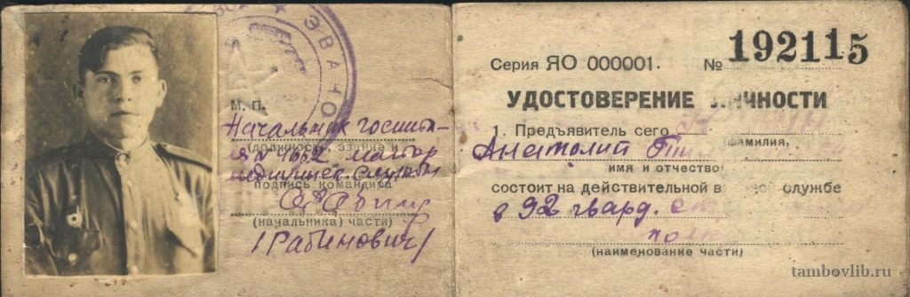 Удостоверение личности участника Великой Отечественной войны, командира пулеметного взвода 382 гвардейского стрелкового полка младшего лейтенанта Козина Анатолия Тимофеевича. Документ из семейного архива внучки Межеделовой Елены Юрьевны.1943 Межпоселенческая центральная библиотека Инжавинского района Документ