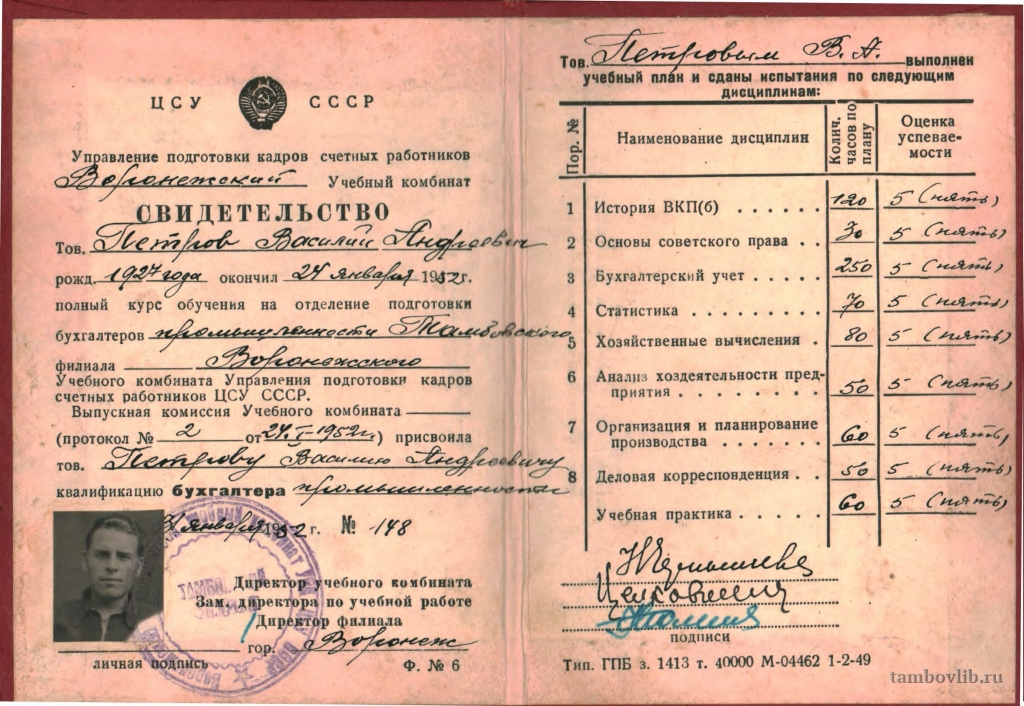 Свидетельство об окончании обучения Василия Андреевича Петрова