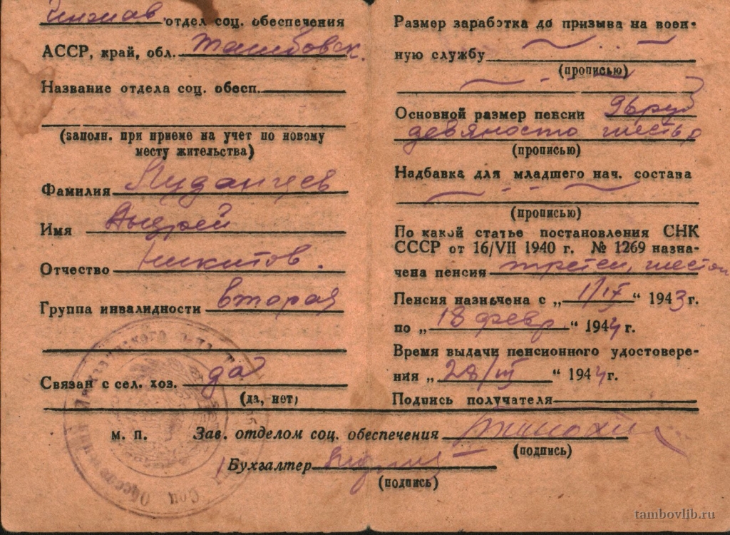 Родился 1 июля 1907 г. в с. Лопатино Инжавинского района Тамбовской области. Был призван в 1941 г. Инжавинским РВК Тамбовской области. Воевал на Ленинградском фронте. Был ранен на Синявской Сопке. Вернулся инвалидом в 1945 г. Награжден орденом «Отечественной войны I степени». Умер 22 сентября 1989 г. На фото Пенсионное удостоверение инвалида Отечественной войны.Добавлена 6 Мая 2015