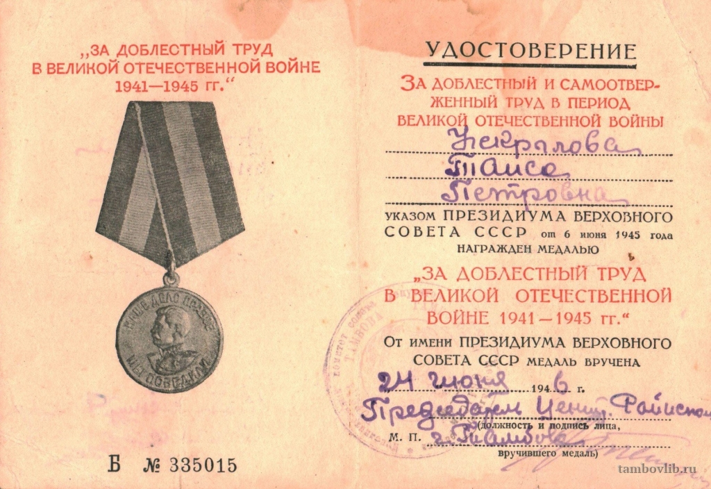 Родилась 5 марта 1914 г. в Тамбове. Труженик тыла. Работала воспитателем в детском саду № 36 от завода «Ревтруд». Ветеран труда. Награждена медалью «За доблестный труд в Великой Отечественной войне 1941-1945 гг.» и юбилейными медалями. Умерла в 2009 г.Добавлена 7 Мая 2015