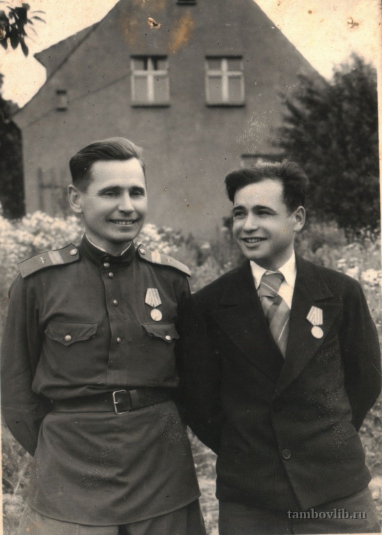 Сержант радио-киномеханик. Родился 16 мая 1920 г. (по паспорту 16 мая 1918 г.) в с. Татарщино Рассказовского района Тамбовской области. Был призван в мае 1938 г. Тамбовским ГВК. Был ранен в 1942 г. Демобилизован 23 ноября 1945 г. Награждён медалями «За боевые заслуги», «За оборону Москвы», «За взятие Кенигсберга», «За оборону Ленинграда». В послевоенное время работал киномехаником, затем начальником Тамбовского кинопрокатного пункта. Умер 26 июля 1960 г. На фото справа.14 августа 1945 ТОУНБ Портрет г. Инстенбург, В. Пруссия
