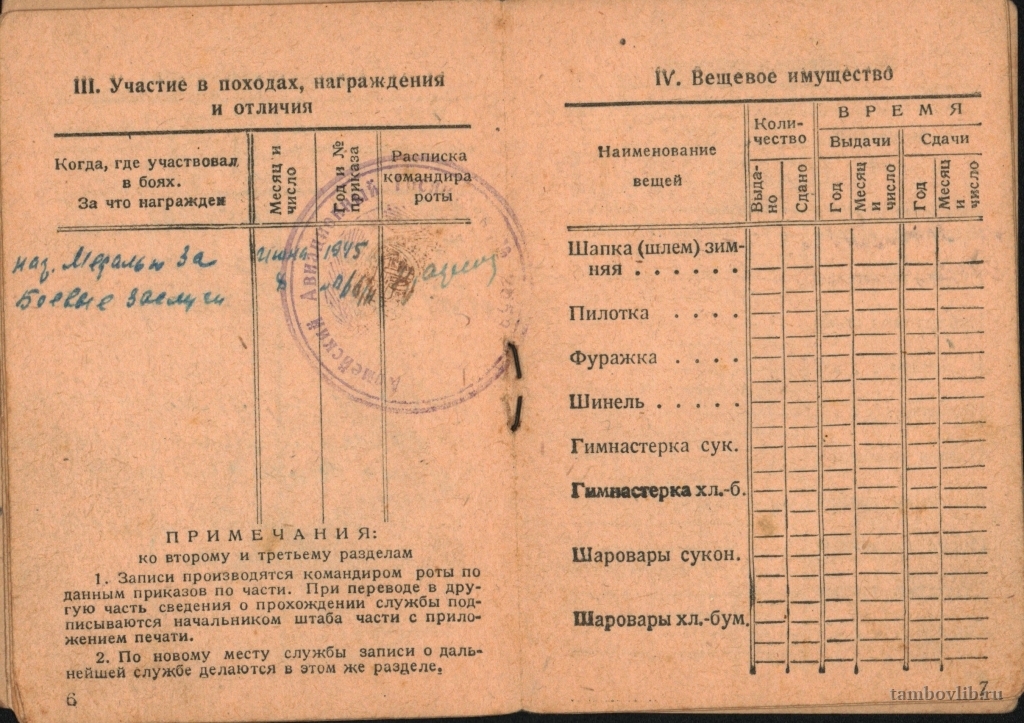 Сержант радио-киномеханик. Родился 16 мая 1920 г. (по паспорту 16 мая 1918 г.) в с. Татарщино Рассказовского района Тамбовской области. Был призван в мае 1938 г. Тамбовским ГВК. Был ранен в 1942 г. Демобилизован 23 ноября 1945 г. Награждён медалями «За боевые заслуги», «За оборону Москвы», «За взятие Кенигсберга», «За оборону Ленинграда». В послевоенное время работал киномехаником, затем начальником Тамбовского кинопрокатного пункта. Умер 26 июля 1960 г. На фото Красноармейская книжка.Добавлена 8 Мая 2015