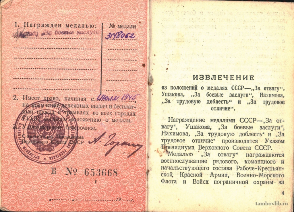 Сержант радио-киномеханик. Родился 16 мая 1920 г. (по паспорту 16 мая 1918 г.) в с. Татарщино Рассказовского района Тамбовской области. Был призван в мае 1938 г. Тамбовским ГВК. Был ранен в 1942 г. Демобилизован 23 ноября 1945 г. Награждён медалями «За боевые заслуги», «За оборону Москвы», «За взятие Кенигсберга», «За оборону Ленинграда». В послевоенное время работал киномехаником, затем начальником Тамбовского кинопрокатного пункта. Умер 26 июля 1960 г.
