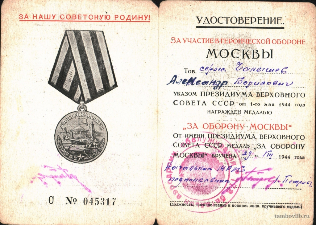 Сержант радио-киномеханик. Родился 16 мая 1920 г. (по паспорту 16 мая 1918 г.) в с. Татарщино Рассказовского района Тамбовской области. Был призван в мае 1938 г. Тамбовским ГВК. Был ранен в 1942 г. Демобилизован 23 ноября 1945 г. Награждён медалями «За боевые заслуги», «За оборону Москвы», «За взятие Кенигсберга», «За оборону Ленинграда». В послевоенное время работал киномехаником, затем начальником Тамбовского кинопрокатного пункта. Умер 26 июля 1960 г.28 августа 1944 ТОУНБ Документ