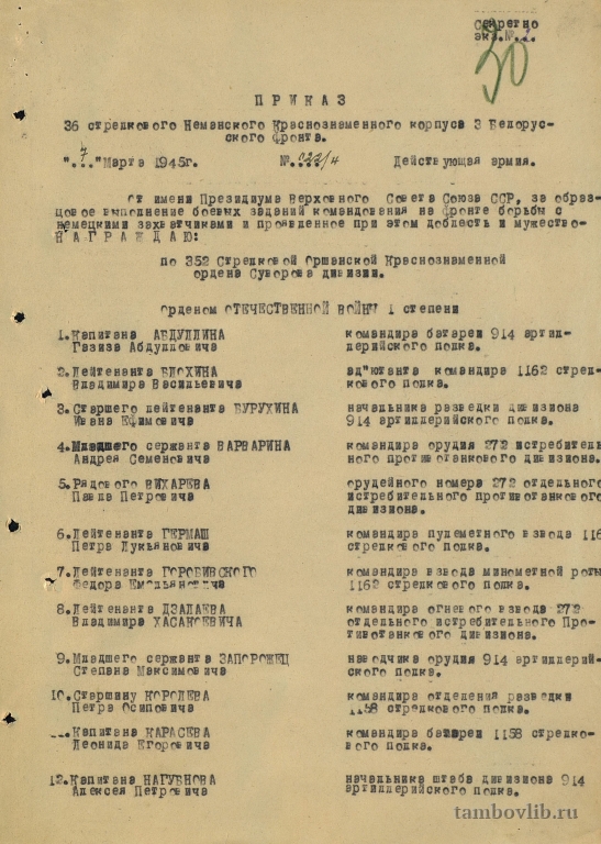 Приказ о награждении Алексея Петровича Нагубнова Орденом Отечественной войны I степени